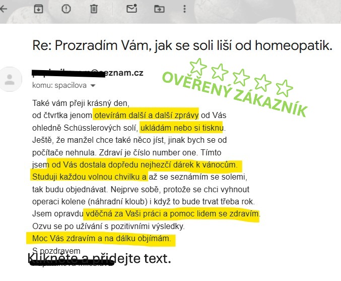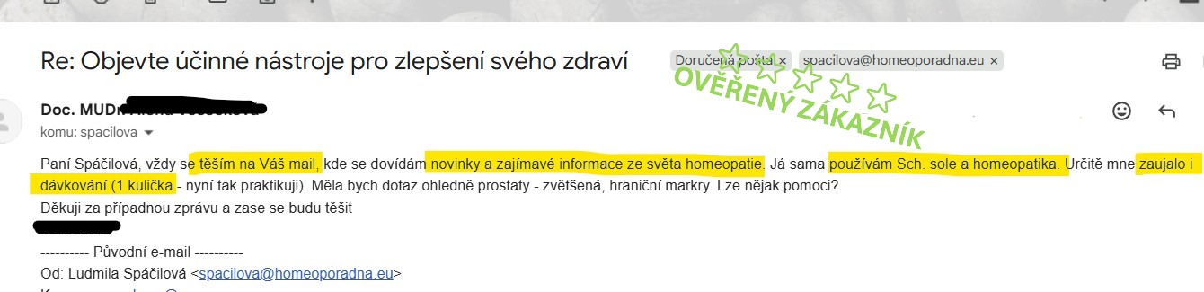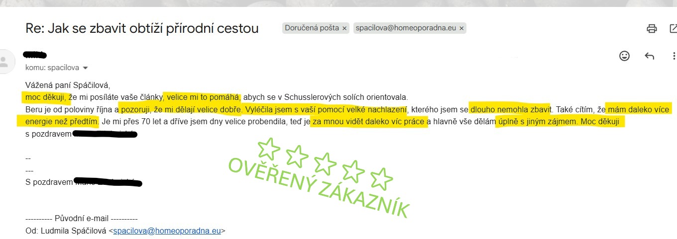 Děkuji Vám za cenné rady v době, kdy jsem onemocněla covidem. Možnost užívání Sch. solí a určitých doporučených homeopatik mne maximálně pomohla. Zůstávám u nich i po prodělaném covidu. Je opravdu fascinující co příroda nabízí. Velice si cením Vaší citlivosti , empatie, kterou lidem ukazujete a předáváte. Záleží Vám na lidech. Toto je také důvod, proč Vás vždy ráda doporučím.
